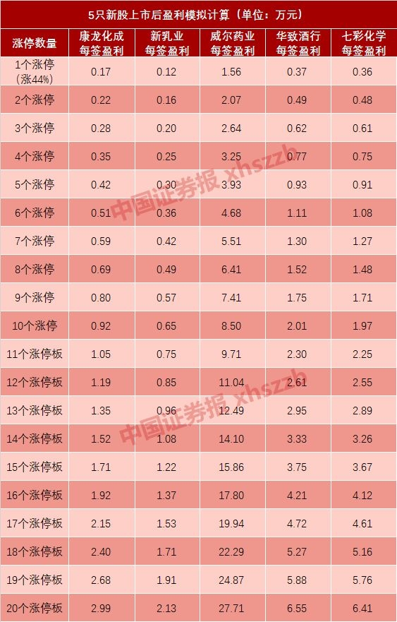 如果康龙化成、新乳业、威尔药业、华致酒行、七彩化学5只新股上市后,能达到2018年以来上市新股的平均水平——8个涨停板的话,则每签获利分别约为0.69万元、0.49万元、6.41万元、1.52万元和1.48万元(据预估一16.43元/股计算)。