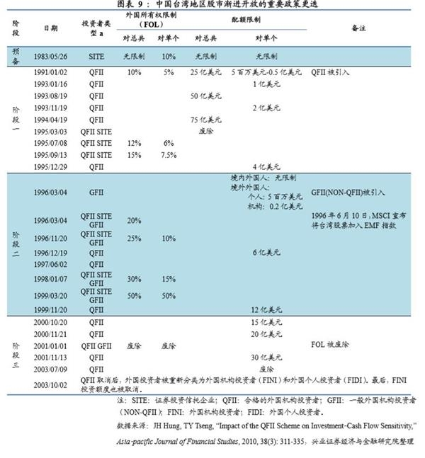 (2)我们早在2018年年中《渐进开放的红利:外资流入对汇率贬值的免疫——外资流入A股系列研究之七》中就在市场中最先提出:渐进有序开放具有“制度红利”,即免疫于宏观经济波动是践行渐进开放策略的新兴市场所普遍享受的“制度红利”,而且中国更是最最特殊的新兴市场(没有之一)。去年以来,我国重启了2015年“811汇改”后因资本外逃压力而暂停新批的QDII、RQDII和QDLP额度,并放开QFII和RQFII资金汇出限制,取消本金锁定期要求,这证明了我们的开放策略不变,外资持续流入可期,这方面类似中国台湾地区。