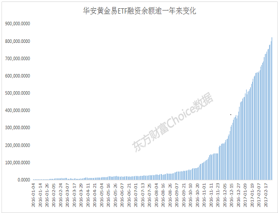 而国内黄金投资者也的热情,也随着金价一路反弹而持续高涨,甚至加杠杆做多黄金。融资融券数据显示,截止2017年3月1日两市唯一一只可以融资融券的华安黄金易ETF融资余额增长至82.25亿元,较年初的1月3日的45.41亿元增长81%,几近翻倍;而较2016年年初的1月4日的709万元,翻了1159倍。