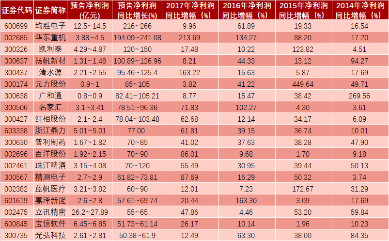 截至1月21日,共有1444家上市公司披露了2018年业绩预告,其中969家公司预计业绩增长,占比67.11%。单一年度的业绩增长显然无法反映上市公司的成长性,持续的业绩增长才更为重要。据数据统计,2014年-2017年净利润同比均实现增长, 且2018年业绩预增的公司共有123家。