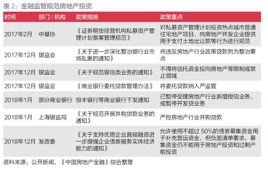 在金融方面,2017年2月,中国证券投资基金业协会发布《证券期货经营机构私募资产管理计划备案管理规范》,提出对私募资产管理计划投资热点城市普通住宅地产项目、向房地产开发企业提供用于支付土地出让款等行为进行规范。3月银保监会主席郭树清在国务院新闻办公室举办的发布会上表示,商业银行要紧紧把握“房子是用来住的、不是用来炒的”定位,分类实施房地产金融调控,促进房地产市场平稳健康发展,有效推进去库存。