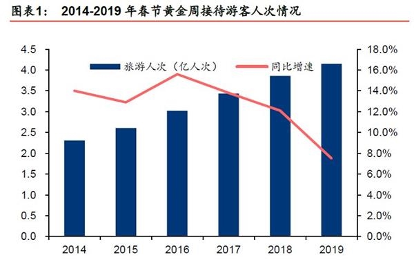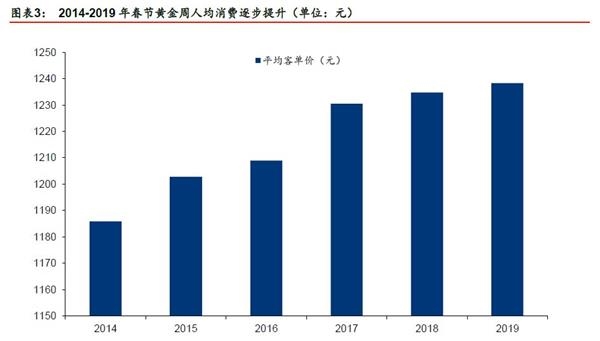 另外,根据国家旅游局数据测算,2014-2019年春节黄金周人均消费额从1185.9元提升到1238.3元,人均消费金额有望持续增加。