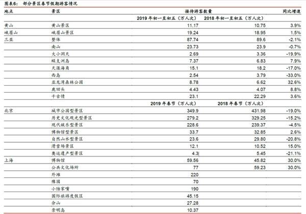 尽管如此,部分传统景区的热度仍在持续。黄山景区2019年2月5-9日游客同比增3.9%。峨眉山景区2月5-9日客流同比增1.5%。上海春节期间推出59项特色旅游产品,全市主要旅游景区点游客同比增25.2%。三亚2月5-9日各景区游客同比降2.1%(2018年春节同比增6.8%),千古情积极开展摘椰子表演等特色外景节目,游客同比提升3.6%。假期前6天三亚、海口免税购物额同比大增32%和22%。