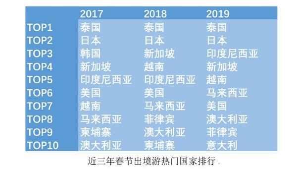 根据截至2019年1月初的携程出境跟团游、自由行的订单人数,报告预计今年春节最受中国游客青睐的前15名国家分别是泰国、日本、印度尼西亚、新加坡、越南、马来西亚、美国、澳大利亚、菲律宾、意大利、阿联酋、柬埔寨、新西兰、英国、西班牙。从携程发布的17-19年《春节旅游趋势预测报告》来看,泰国、日本始终为热度前二的出境目的地,韩国则自萨德事件之后吸引力下降,18-19年春节连续两年跌出前十,印度尼西亚、马来西亚、澳大利亚等目的地热度有所提升。