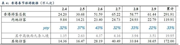 东吴证券认为,香港旅游高铁效应仍在,春节前6天香港内地访客增速约33%,仍受益于高铁的开通,乘坐高铁赴港的内地游客占比提升至16.6%,较2018年元旦和国庆的15%进一步提升,高铁已成为赴香港旅游的重要出行方式之一。