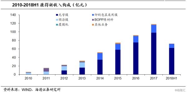 光学膜龙头企业。康得新成立于2001年,作为一家材料高科技企业,主要从事高分子材料的研发、生产和销售,包括新材料、智能显示和碳材料。从收入构成上看,2012年开始光学膜逐渐占据公司收入的重要地位,2018H1光学膜收入占总营业收入的86.58%。