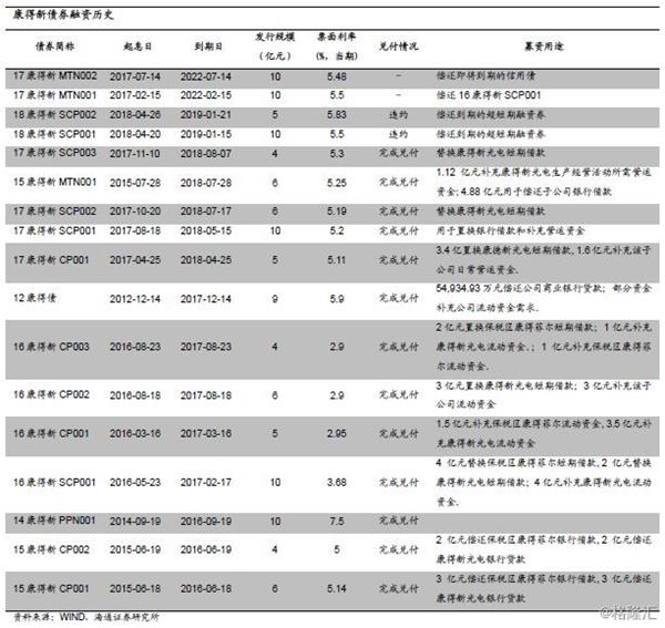 此前无违约历史。2010年康得新于深交所上市,2012年发行第一只债券,到目前为止共发行债券17只。除去近期违约的两只债券外,尚有两只存量的中期票据于2022年到期,其余13只债券均已完成兑付,未出现过违约情况。