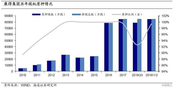 迹象一:高股权质押比例。根据历年年报、18年三季报披露的数据,以及2019年1月2日控股股东质押公告,以质押股数和持股总数之比计算质押比例,可以看到康得集团质押比例常年处于高位,2013-2017年连续处于99%以上水平,几乎质押全部所持有的康得新股票。2018Q3质押比例下降至92.59%,2019年1月2日又回复到99.45%的高位。