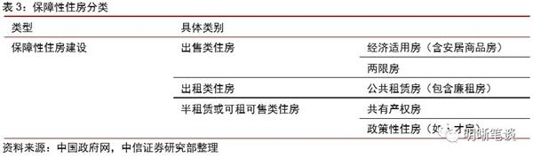 其中保障性住房主要分为出售类住房、出租类租房和办租赁或可租可售类住房。出售类住房包括:经济适用房(包括安居型商品房)、两限房等;出租类住房:公共租赁住房(包含廉租房);半出售或可租可售类住房:共有产权房、政策性住房(如人才房)。