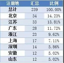 从注册地来看,北京和江苏的企业超过30家,分别是34家和33家。之后的是广东28家,浙江23家,上海17家,深圳14家,安徽和山东各12家。另外有7家公司来自贫困县。