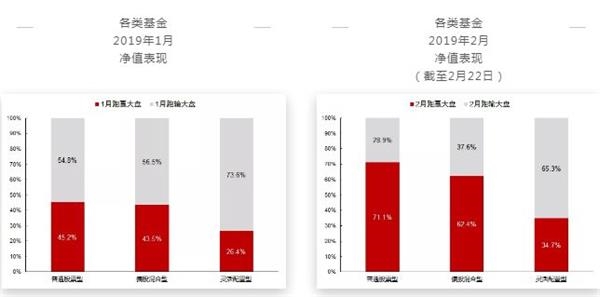 截至2月22日,2019年普通股票型/偏股混合型/灵活配置型基金相对上证综指的超额收益平均只有1.72%/1.04%/-3.40%,相对创业板指的超额收益平均只有-2.29%/-2.97%/-7.41%。