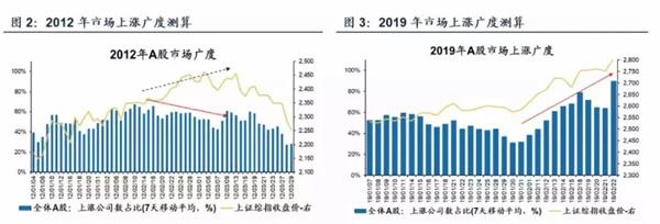 3、从市场上涨广度来看,12年和16年在行情的末期,上证综指仍在向上、但市场上涨的广度率先下降,也就是出现了“指数涨而个股涨不动”的局面,最新的19年市场广度数据仍在上行。