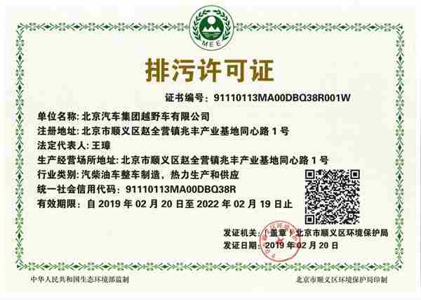 2019年2月20日,越野车公司经过短短三个月排污许可证紧张有序的申报准备工作,在顺义区环保局的支持和帮助下,在集团公司主管部门指导下,顺利的取得了由顺义区环保局核发的排污许可证,由此实现中国整车制造业首张排污许可证落户北汽集团,实现了今年北汽集团首季环境保护工作的“开门红”!