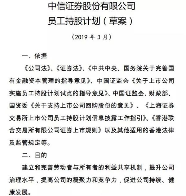 关于推行本次员工持股计划的目的,中信证券在草案中表述到,是建立和完善劳动者与所有者的利益共享机制,提升公司治理水平,提高公司的凝聚力和竞争力,促进公司持续、健康发展。