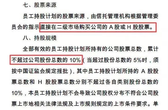 草案显示,中信证券拟推行员工持股计划,资金来源为公司应付员工的合法薪酬,由信托机构直接在二级市场购买公司A股或H股股票,累计不超过公司股份总数的 10%。本次员工持股计划的有效期为10年,分年实施。
