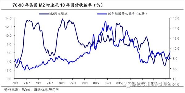 但对于宏观经济,货币增速和利率的关系在不同阶段往往呈现不同特征。以美国为例,上世纪80年代末之前,货币增速和利率有明显的反向关系。这一时期,当M2同比增速降低,货币收紧时,美国10年期国债收益率相应走高,反之,当M2增速回升,流动性宽裕,利率回落。其中,70年代美国货币增速经历两轮大起大落,美债收益率也随之出现两轮先降后升,而80年代初,美联储为治理通胀持续收缩货币供应量,美债利率也达到了阶段性的高位。