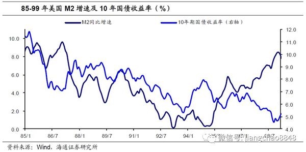 但到了80年代末到90年代初,伴随美国货币增速下行,利率同步回落。88-93年,美国的货币增速和利率走势几乎完全同步,90-92年M2增速由6.5%降至0附近,而同一时期10年期美债收益率也由8.9%回落至5.3%。而在90年代中期以后,货币增速和利率的关系时而反向、时而同向,似乎并不稳定。