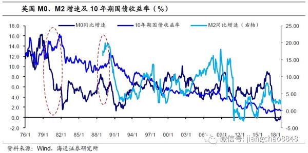 这种现象并非特例,类似的情形也发生在英国。上世纪70年代末至90年代,英国部分时期货币增速与利率反向,如79-82年、88-89年英国的M0增速和10年期国债收益率呈较明显的反向关系,但随后的90-92年间,M0增速由6.5%降至2%,利率也由12.5%大幅降至6.5%,两者同步下行。长期来看,随着90年代以来英国货币增长中枢回落,利率也长期下行,10年期国债收益率由12%降至2%左右。