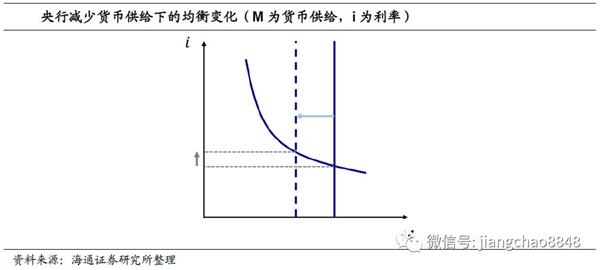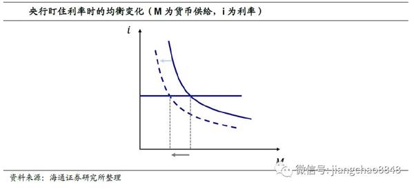 如果以货币供应量作为货币政策的中介目标,央行通过影响基础货币调节货币增速,那么货币增速本身便包含了政策含义,具有一定的外生性,主要反映了央行对货币供给的收紧或者放松,因此可以视作是引起利率变动的原因。而如果以利率作为货币政策的中介目标,货币增速则不是央行政策直接调控的工具,而是更多地受到信用活动扩张或者收缩的最终影响,其实反映了利率变动后对货币需求的变化。盯住利率的情况下,当经济对货币需求下降,需求曲线左移,新的均衡点就对应着货币供应量的降低。