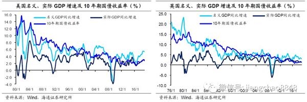 而从长期来看,利率和货币增速的趋势更像是一致的。以80年代中期为界对比可以发现,利率的趋势与货币增长的中枢有关:货币增速高、利率趋升,货币增速低、利率趋降。70年代到80年代早期,美国货币增速水平在10%左右的高位,10年期国债的利率从6%左右上行到接近15%,而在80年代以来,货币增速中枢大幅降低到5%左右,近30年间10年美债收益率也由8%降至2%附近。90年代末以来,虽然M2增速波动放大,但利率仍延续了走低的趋势。