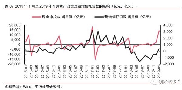 货币政策相对宽松,宽货币背景给信托贷款回暖提供空间。央行在2018年第四季度货币政策执行报告中去掉了关于“中性”和“把好货币供给总闸门”的表述,强调了逆周期调节,货币政策出现边际放松。信托产品中单一信托产品占比较大,资金面受到银行的约束,从历史数据来看货币市场流动性与新增信托贷款变化相对同步。2019年1月,央行现金净投放量为14,300亿元,较上月增加11,655亿元,新增信托贷款规模应声上涨。