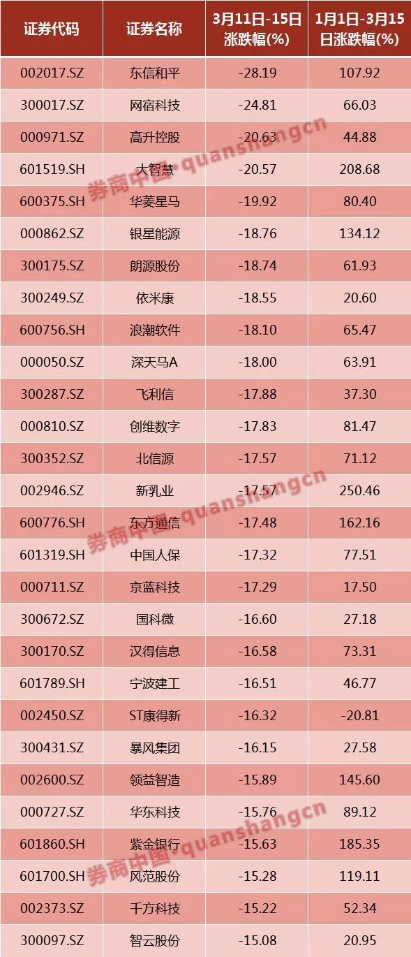 数据显示,上周跌幅超过15%的股票共有28只,其中跌幅跌幅超过20%的共有4只,分别是东信和平、网宿科技、高升控股、大智慧,跌幅分别是28.19%、24.81%、20.63%和20.57%。