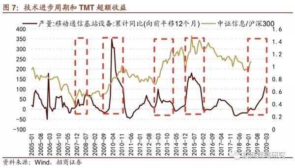【论道·机杼】地产的老逻辑和TMT的新逻辑。地产板块的超额收益往往开始于地产销售情况大幅回落的时候。当地产周期的指标增速由正转负时,也就正好是地产指数相对沪深300指数超额收益上行之时。地产的老逻辑是在于,地产不能成为经济的拖累,那么地产周期指标增速为负时,地产政策也将会逐渐趋向于宽松。TMT的新逻辑在于,通信技术的发展是大部分技术进步的基础,技术进步是中证信息指数超额收益出现的基础;每一次移动基站放量触底大幅回升一年后,中证信息指数相对沪深300指数的超额收益开启。而本轮移动基站数量同比增速的拐点出现在2018年2月,则2019年2月开始,中证信息指数相对沪深300指数超额收益开始回升。