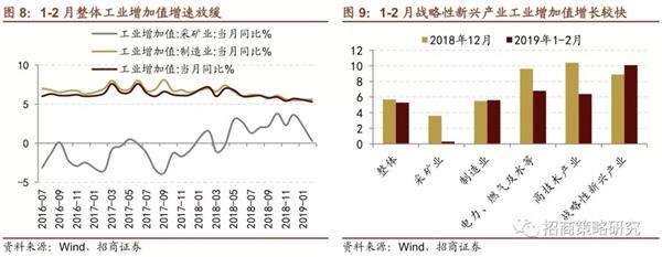 1-2月整体工业生产放缓,制造业产值增速略有回升,战略性新兴产业产值增加较快。2019年1-2月,整体工业增加值累计同比增速为5.3%,相比去年12月下降了0.4个百分点;受到石油和煤炭开采进度放缓,采矿业工业增加值同比增速为0.3%,相比去年12月月下降了3.3个百分点;制造业工业增加值增速相比去年12月有所反弹,累计同比增速达到5.6%,食品加工、化学纤维等制造等生产加速对于整体制造业生产反弹有一定的拉动作用。值得注意的是,战略性新兴产业的累计同比增速达到10.1%,远高于整体工业增加值的增长速度,其中,3D打印设备、石墨烯、城市轨道车辆、新能源汽车、太阳能电池等产品产量增长较快,同比分别增长199.6%、166.7%、57.1%、53.3%和13.5%。