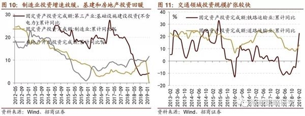 1-2月全国固定资产投资增速回升至6.1%,制造业投资回落幅度较大,基建和房地产投资增速上行。2019年1-2月,制造业投资增速下滑至5.9%,相比2018年下降了3.6个百分点;受到施工进度加快以及前期土地购置费用的快速上升的影响,房地产投资增速反弹至11.6%,但由于竣工面积和销售情况不容客观,未来房地产投资的可持续有待验证。
