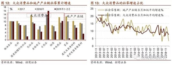 2019年1-2月社会消费品零售额增长企稳,必需消费品依然占优,地产产业链弱势。从分项数据来看,汽车零售额同比跌幅收窄对于整体社会消费品的拖累作用减轻,日用品、食品类的零售金额有所回落但依然在高位,服装类零售额降幅明显。值得注意的是,大众消费品的(如粮油食品、日用品、药品等)的需求明显好于地产产业链(如家具、家电等)的需求,必需消费品的零售额增速占优。未来企业增值税率下调和个税抵扣等减税措施将对于消费形成积极促进作用。