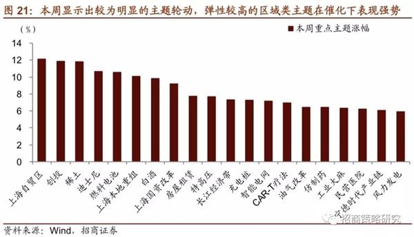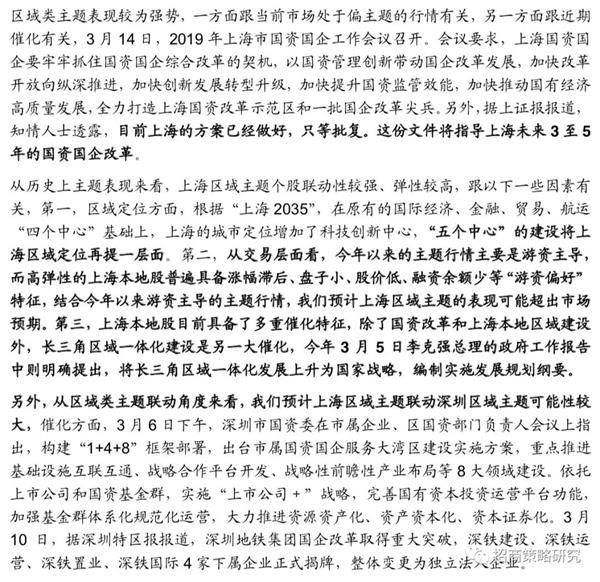 下周区域类主题投资的思路参考:1、上海区域主题个股普遍具备涨幅滞后、盘子小、股价低、融资余额少等“游资偏好”特征,在游资主导行情下,我们预计上海区域主题的表现可能超出市场预期。可依循的思路包含上海本地国企改革、长三角一体化建设等;2、从区域类主题联动角度来看,在具备一定的催化条件之下,结合当前处于催化带动主题行情的阶段,上海区域主题联动深圳区域主题可能性较大,可重点关注深圳区域主题。