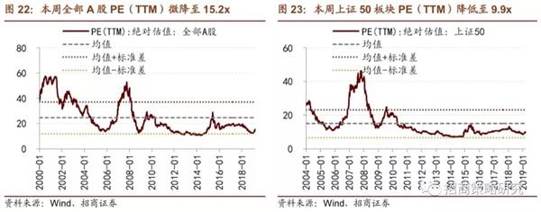 本周整体A股估值提升,中小创板块提升明显。全部A股PE(TTM)由上周的14.9X提升至本周的15.2,处于2000年以来历史估值水平的25.0%分位数。上证50板块PE(TTM)由上周的9.7X微升至本周的9.9X,处于2005年以来历史估值水平的27.3%分位数。创业板板块PE(TTM)由上周的41.1X上升至本周的41.8X,处于2009年以来历史估值水平的25.6%分位数。中小板板块PE(TTM)由上周的26.7X上升至本周的27.3X,处于2009年以来历史估值水平的19.6%分位数。