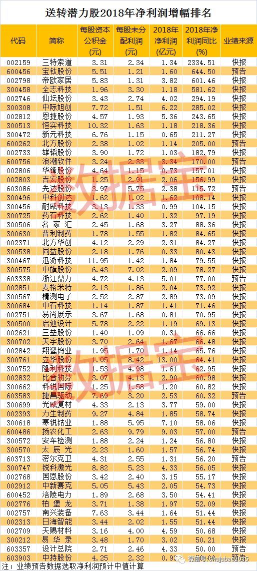 数据宝统计显示,尚未披露年报的个股中,最新股价在20元以上,A股股本在5亿股以下,最新一期每股资本公积金和每股未分配利润均在1元以上,2018年快报或预告盈利且快报或预告净利润增幅中值在20%以上的个股,共计131只。