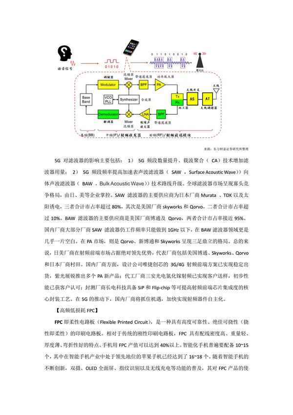 其中带通滤波器用于筛选指定频带的高频信号,功率放大器(PA)用于放大滤波后的信号,以保障信号传送距离,双工器用于频分复用(FDD)系统中双工切换以分离接收和传送信道,天线开关用于切换频段和发射接收状态,天线调谐器用于实现发射机与天线间的阻抗匹配,从而使天线在任何频率上有最大的辐射功率,低噪声放大器(LNA)主要用于接收通道中的小信号放大,从而可以进入射频接收器被处理。射频前端集成化是趋势,其中滤波器和功率放大器PA是关键。