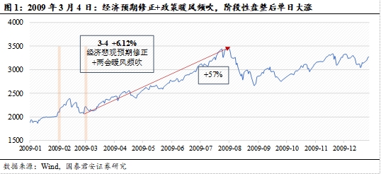 历史上,盘整后的大涨是因为什么?年后的市场,我们可以看到明显的2个信号:以上证综指为例,2月25日的5.60%以及本周五的3.20%。以此为标准,我们筛选历史上类似的时点,以探究盘整之后的大涨是何原因。回溯历史,找到近似的3个时间点:1)2016年,经历年初的“熔断”,3月2日上证综指上涨4.26%确定上涨趋势,但在5月进入盘整期,5月31日上涨3.34%,而后市场从2900点上涨至3200点。2016年5月31日的大幅上涨,是受到6月纳入MSCI指数概率提升以及深港通落地时间临近的双重催化,券商保险等金融股强势爆发。2)2015年4月16日上证综指上涨2.71%,4月累计上涨18%,经历5月上半月的盘整,5月19日当日上涨3.13%,而后市场从4300点上涨至5178点。2015年5月19日的大涨是因为市场关注的国企改革、新兴产业等事件进一步升温(5月18日国务院办公厅发布的《关于2015年深化经济体制改革重点工作意见的通知》、中国北车正式退出、上交所领导再次强调“战略新兴产业板”等),国企改革概念股、科技股强势爆发。3)2009年2月6日上证综指上涨3.97%而后在2月中下旬进入盘整,3月4日当日上涨6.12%,而后市场从2200点上涨至3478点。2009年3月4日的大涨是因为基本面的悲观预期的修正,一方面是对于经济预期的大幅修正(从2008年11月的38.8修复至2009年2月的49,3月为52.4),另一方面是两会期间政策暖风不断,因此当日银行保险大幅拉升、上证50上涨6.88%。