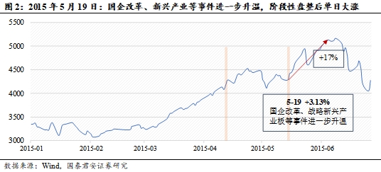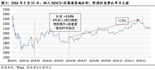 历史上,盘整后的大涨是因为什么?历史上盘整后的大涨有3个近似的时间点:1)2016年3月2日上证综指上涨4.26%,但在5月进入盘整期,5月31日上涨3.34%,而后市场从2900点上涨至3200点。5月31日的大幅上涨受到6月纳入MSCI指数概率提升以及深港通落地时间临近的双重催化,券商保险等金融股强势爆发。2)2015年4月16日上证综指上涨2.71%,而后经历半个月盘整,5月19日当日上涨3.13%,而后市场从4300点上涨至5178点。2015年5月19日的大涨是因为市场关注的国企改革、新兴产业等事件进一步升温(国企改革相关文件、中国北车正式退出、“战略新兴产业板”等),国企改革概念股、科技股强势爆发。3)2009年2月6日上证综指上涨3.97%而后在2月中下旬进入盘整,3月4日当日上涨6.12%,而后市场从2200点上涨至3478点。2009年3月4日的大涨是因为经济预期的大幅修正以及两会期间政策暖风不断。