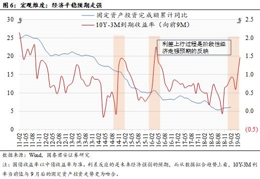 宏观维度上看,经济平稳走强的预期较明显。尽管2011年以来我国的固定资产投资同比增速处于下行趋势,但是下行过程中的节奏分化仍较明显。我们结合10年期和3个月国债收益率利差判断阶段性的经济强弱预期,当利差扩大意味着经济预期向好,利差缩小乃至为负意味着经济预期向差。利差反映的是经济预期,因此当期的利差能够反映未来某期的投资,从数据拟合的角度,将利差数据向前移动9个月两者拟合效果最优。可以看到,历年的春季躁动期间10Y-3M利差出现小幅上升,而今年上升趋势异常明显,接近2016年的阶段性高峰。因此,结合来看,宏观和中观相印证,将对今年经济改善预期形成进一步强化。