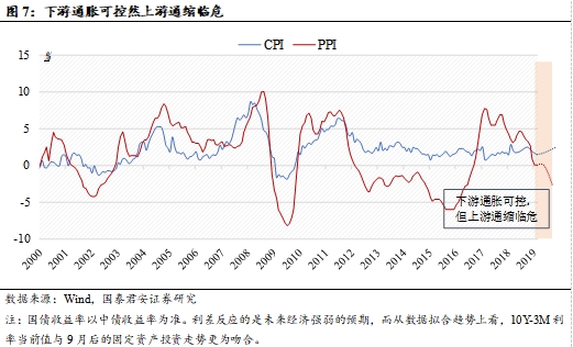 为什么我们认为CPI不会造成货币政策约束?下游通胀可控然上游通缩临危。当前市场上投资者担忧CPI上行对降准、降息等货币政策形成约束,我们认为当前是否宽松核心取决于上游通缩危机。历史上,通胀制约货币政策甚至加息的关键点在于CPI和PPI同时上升导致的物价飞涨,比如2004年10月CPI为4.3%、PPI为8.4%,央行开始加息;2010年10月CPI为4.4%、PPI为5.04%,央行开始加息。当前情形较之前有明显不同:其一,CPI和PPI出现较为明显的背离,CPI平稳有向上预期,PPI向下有通缩预期;其二,CPI上行并非需求带动,而是猪肉供给原因导致的被动上行。当前,2月CPI为1.5%处于可控范围内,然而PPI已下滑至0.1%,下半年工业生产走弱,PPI将滑落至负区间。货币政策锚定的是经济需求与实体企业投资环境,CPI固然重要,但与PPI背离、非需求推动型的CPI上升缺乏基础,通胀危机不高,反而工业通缩危机临近。