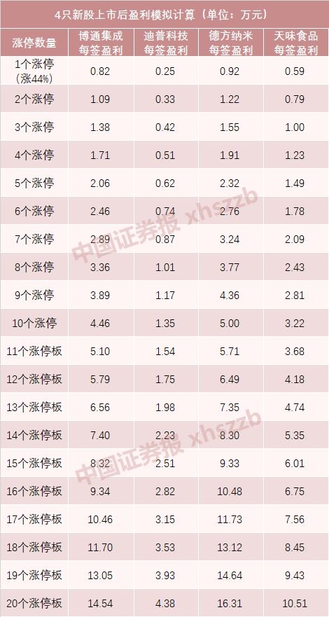 如果博通集成、迪普科技、德方纳米、天味食品4只新股上市后,能达到今年以来上市新股的平均水平——7个涨停板的话,则每签获利分别约为2.89万元、0.87万元、3.24万元、2.09万元。