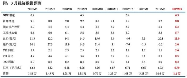预计一季度GDP增速小幅回落至6.3%。以3月份工业增加值增速5.7%计算,2019年一季度工业增加值增速接近6.5%,较2018年四季度工业增加值增速均值5.7%回落近0.2个百分点,由于工业增加值占GDP比重约为1/3,对一季度GDP增速拖累近0.1个百分点。预计一季度GDP增速小幅回落至6.3%左右。