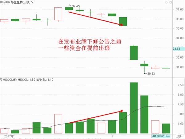 举个例子,华兰生物在2017年7月4日晚间发布2017年半年度业绩预告修正公告,对业绩进行下修,7月4日股价下跌2.76%,在7月5日股价大幅低开随后跌停至收盘,随后股价继续大幅下跌,一直到去年2月份才见到底部。而在2017年6月27日~7月4日,股价就出现了缓缓阴跌的态势,并且成交量也在放大,可见一些资金在出逃。而这期间的沪指走势平稳,显然股价走势是弱于大盘的。