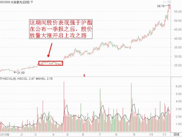 还有一种情况就是业绩好于预期的,在2017年4月12日以后,沪指步入调整的态势,大族激光的股价走势比较稳健,2017年4月14日~2017年4月24日,沪指下跌5.28%,大族激光上涨1.04%。在当年4月24日晚间,公司发布了一季报,在4月25日,股价放量大涨9.95%。