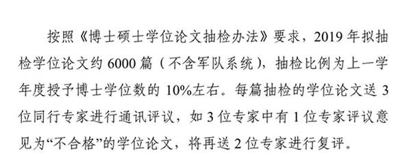 教育部日前公布了“2019年部门预算”,其中提到,按照《博士硕士学位论文抽检办法》要求,2019年拟抽检学位论文约6000篇,抽检比例为上一学年度授予博士学位数的10%左右。每篇学位论文送3位同行专家进行通讯评议,如3位专家中有1位专家评议意见为“不合格”的学位论文,将再送2位专家进行复评。