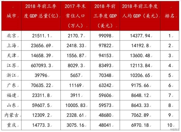 图表2:2018年前三季度人均GDP前10省市自治区排名