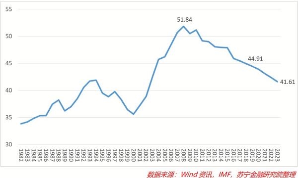 这种下滑趋势还将持续下去。IMF预测,2023年中国国民储蓄率将降至41.61%,较历史峰值下滑10个百分点(参见下图)。
