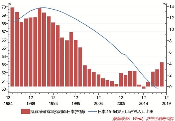 不仅仅是中国,同样因为高储蓄率闻名于世的日本,其国民储蓄率在1991年到达高点34.2%之后,开始震荡下行,并于2016年达到历史最低点(27.3%)。在此期间,日本家庭净储蓄率甚至在2014年出现了历史罕见的负值,这说明日本家庭部门作为一个整体处于“入不敷出”的状态,而这一时期,正是日本老龄化社会加速到来的阶段(参见下图)。