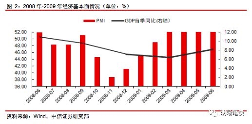 2008年受美国次贷危机影响,我国推行四万亿政策强力刺激经济和促进投资。2008年12月至2009年9月,隔夜利率持续低于1.5%,尤其在2009年上半年,隔夜利率持续低于1%。基本面方面,从2018年10月开始连续5个月PMI低于荣枯线,同时GDP增度也逐渐走弱。主要受到美国次贷危机影响,外需大幅走弱,由于我国经济一直存在“储蓄过高、消费不足”的问题,过剩的产能只能通过内需消化,因而央行推出“四万亿”政策刺激基建投资以期重振经济。同时货币政策处于宽松周期,从9月15日起,央行4次降准、5次降息,并下调公积金利率、准备将存款、流动性在贷款和再贴现利率。