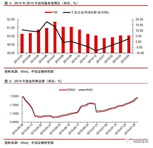 2015年长时间实行宽松的货币政策和信贷政策。2015年5月至7月,隔夜利率持续低于1.5%。一方面,2014年我国经济走向下行通道,2014年8月起工业企业利润增速为负,且PMI也呈现下降趋势。另一方面,为缓解企业“融资难、融资贵”问题,故2015年继续延续2014年的货币宽松政策,央行通过SLF操作、定向降准、降低基准利率等方式不断向货币市场输送流动性,并于2015年2月、4月、9月和10月进行了四次普遍降准,并先后9次下调公开市场逆回购操作利率,货币宽松政策持续时间较长且力度较大。同时,2015年施行宽松的信贷政策,下调住房公积金贷款利率并推进棚改货币化措施,房地产投资企稳回升。
