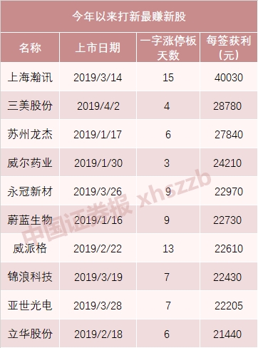 数据显示,今年以来沪深两市共有32只新股上市,30只已开板新股的平均一字涨停板数量为7.23个。2月至今,两市共有18只新股上市,16只已开板新股平均收获了8.5个一字涨停板。值得注意的是,3月中旬上市的上海瀚讯收获了15个一字涨停板,每签获利达到4万元,成为今年到目前为止打新最赚钱的一只新股。截至目前,今年以来的上市新股中,每签获利超过2万元的共有10只。