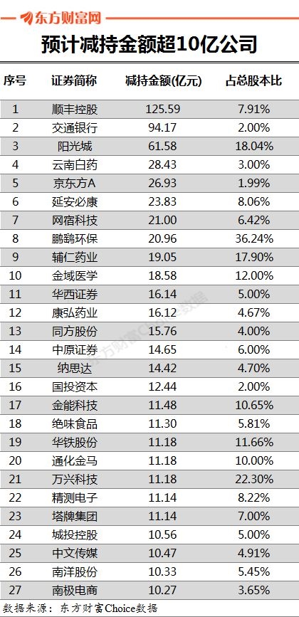 具体到公司,以减持股数上限为参考,年内有27家公司减持参考市值超过10亿,其中顺丰控股4月4日发布公告称,公司股东顺达丰润、元禾顺风、嘉强顺风和刘冀鲁,将合计减持不超过3.5亿股,按最新收盘价计算,参考市值为125.59亿元,居拟减持公司参考市值首位。